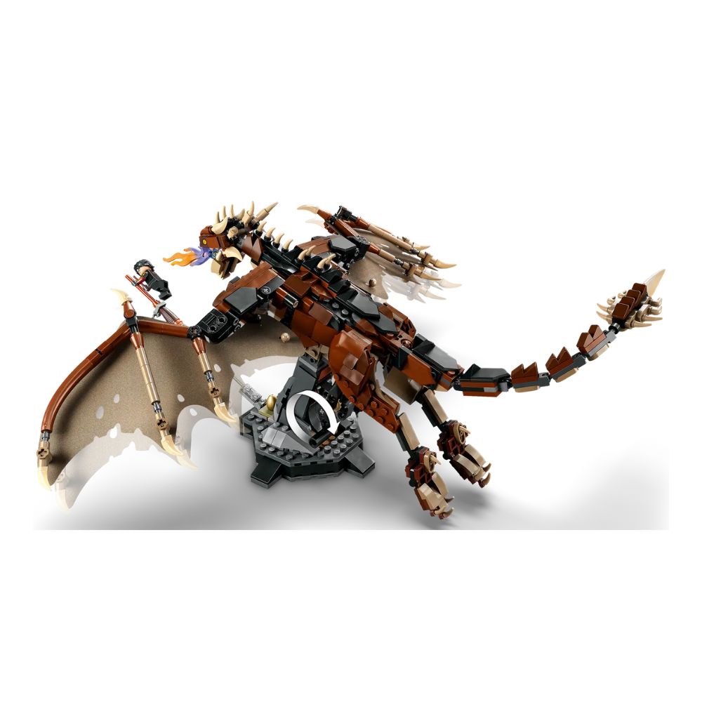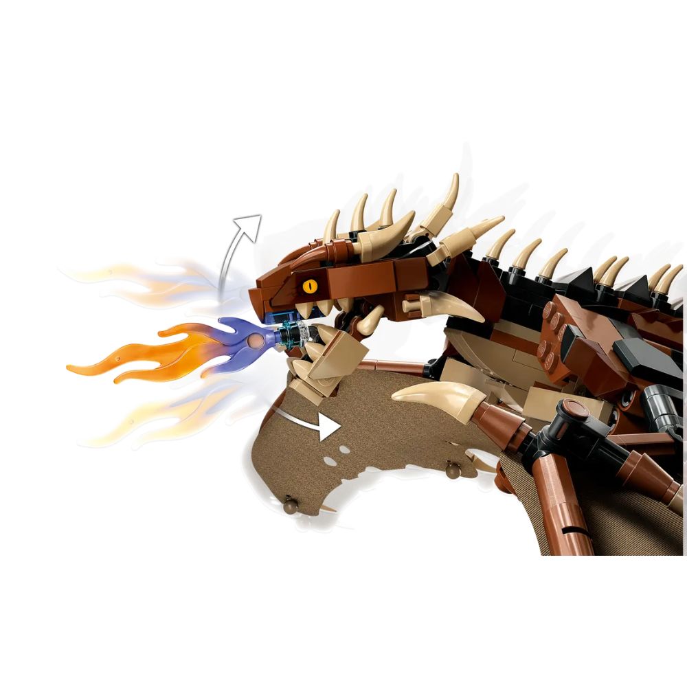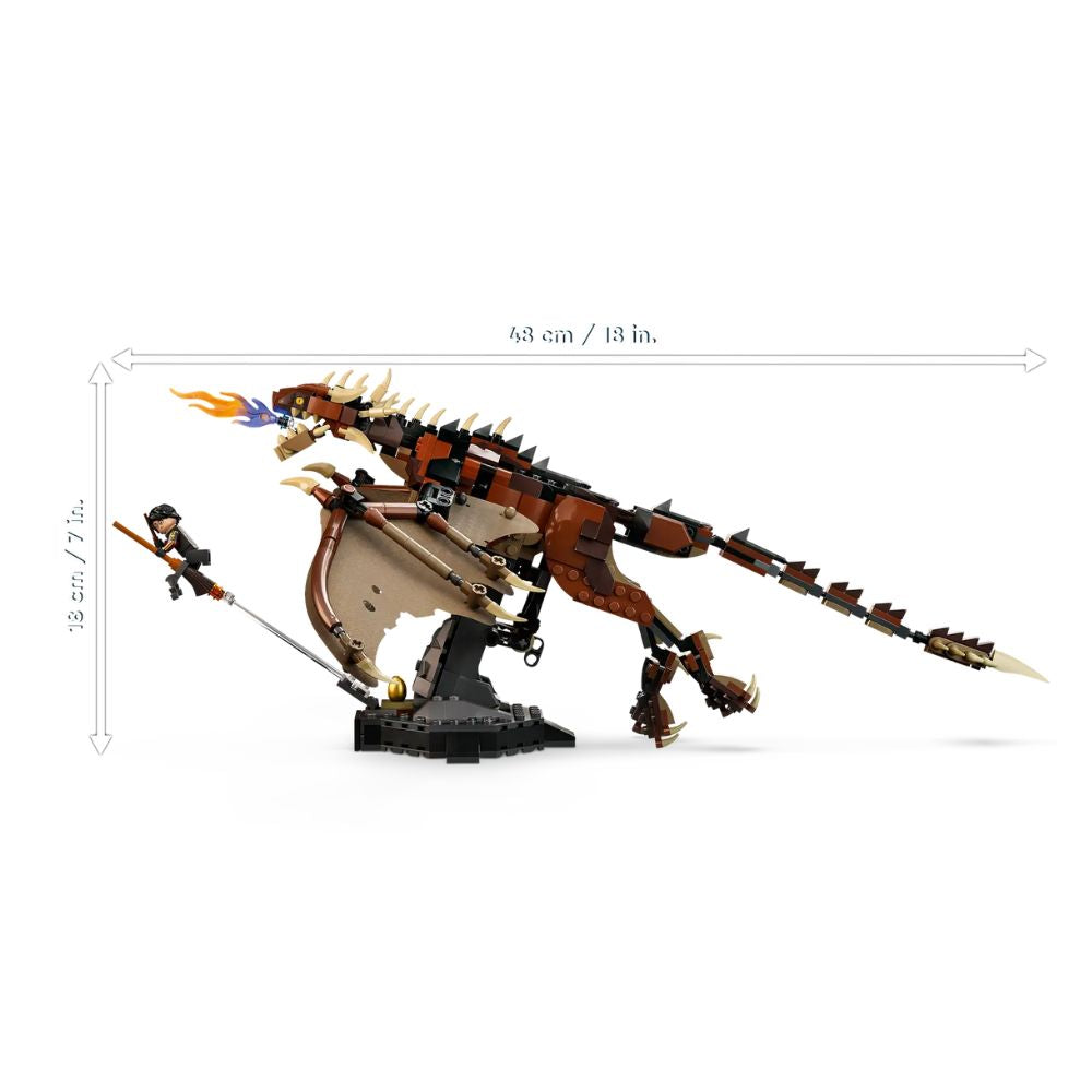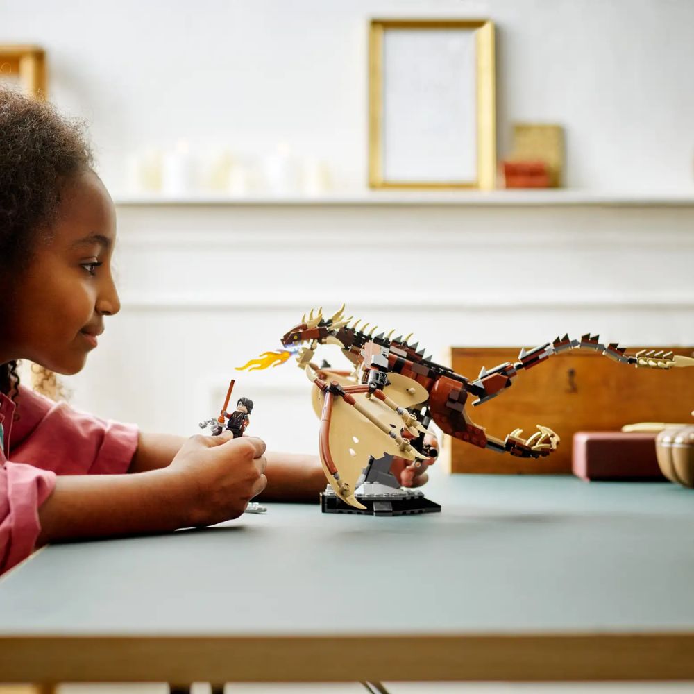 Avec une envergure de plus de 40 cm, ses ailes articulées s’animent grâce à une poignée située à l’arrière, simulant un vol réaliste. Le dragon est fixé sur un socle robuste et accompagné d’une minifigurine de Harry Potter sur son balai, ainsi que d’un œuf doré pour recréer la palpitante première tâche du Tournoi des Trois Sorciers.